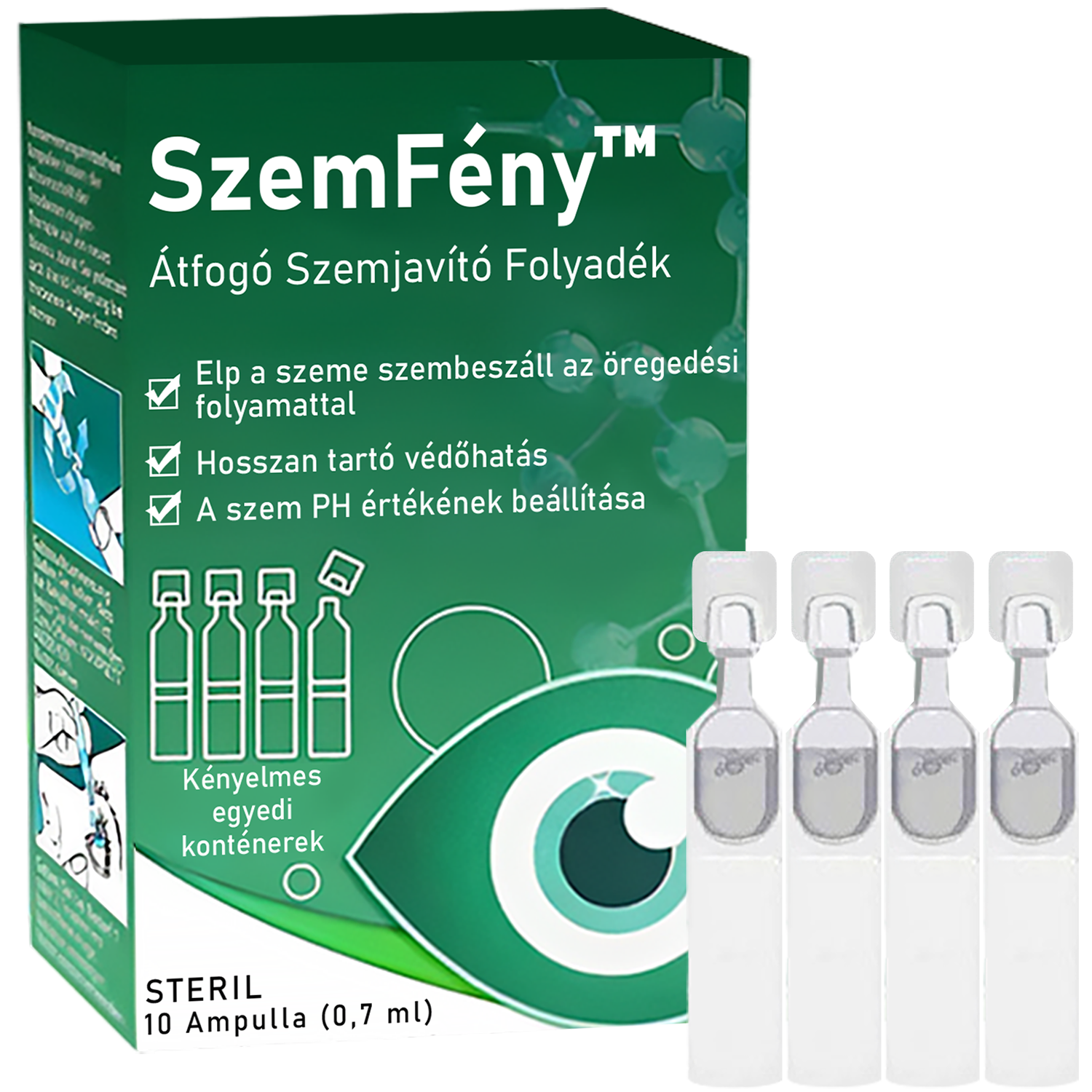 Fő funkciója, hogy a lencsét visszaállítsa normál méretére, javítsa a szemsejtek táplálását és eltávolítsa a sejtekben lévő szennyeződéseket. A SzemFény™ az első és egyetlen CE jóváhagyással rendelkező szemcsepp, amely a korral kapcsolatos látásromlás kezelésére szolgál. Ha a SzemFény™ Átfogó Szemjavító Folyadék a szemedbe kerül, ideiglenesen összehúzza a pupillákat, így javítva a közeli tárgyakra való fókuszálási képességedet, miközben a távoli látás tisztaságát megőrzi. A SzemFény™ szabadalmaztatott technológiát alkalmaz, amely lehetővé teszi, hogy a szemcseppek gyorsan alkalmazkodjanak a könnyfilm természetes pH-értékéhez, így a használata egyszerű és kényelmes. Ráadásul az eldobható szemcseppek rendkívül biztonságosak és higiénikusak!